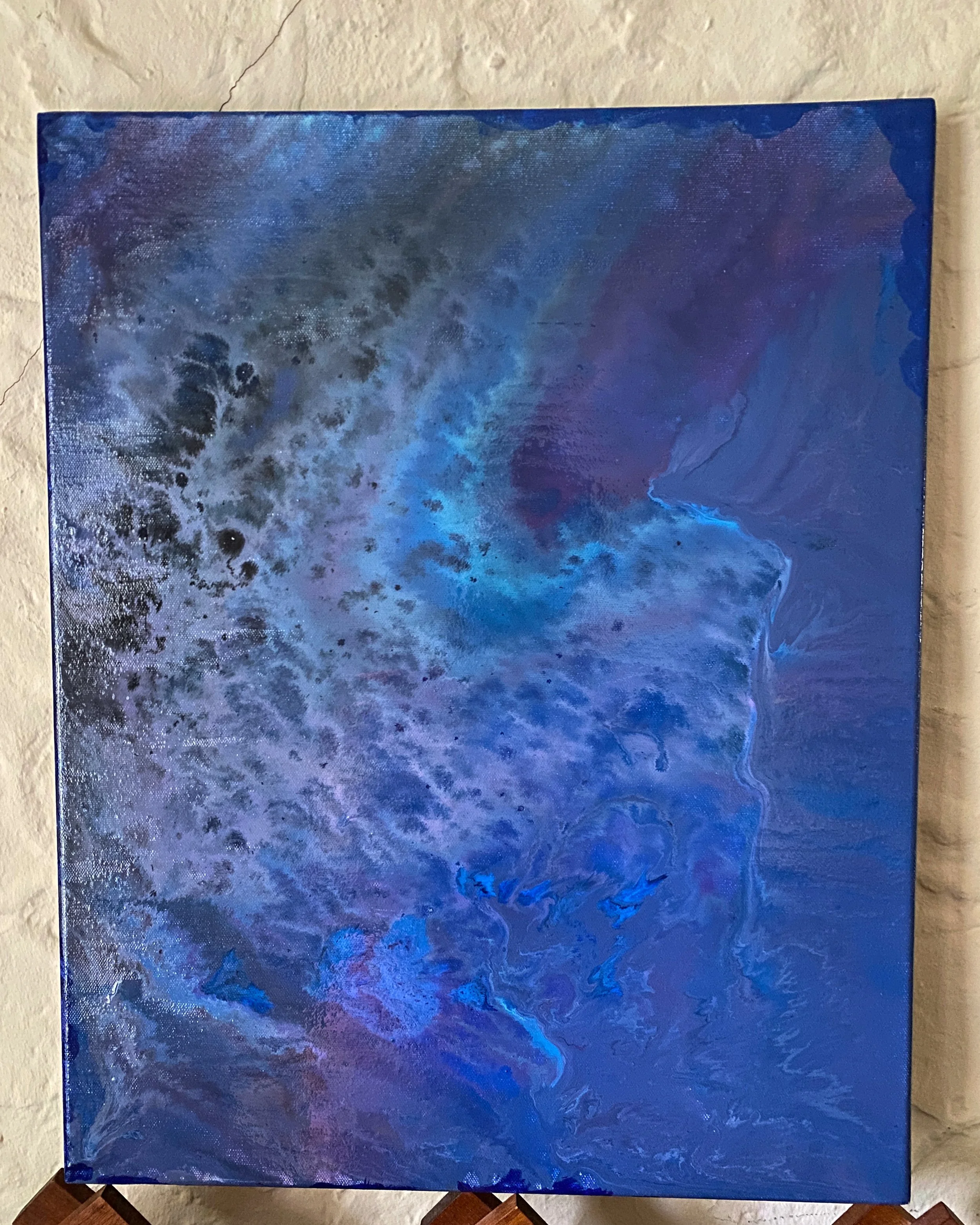"Tidal Glow" is an abstract nautical take on a tidal pool. The glow from the different wildlife and aquatic plants with the mix of the water and sun. On a 12"x12" canvas, this painting was done with the tilting pour painting technique